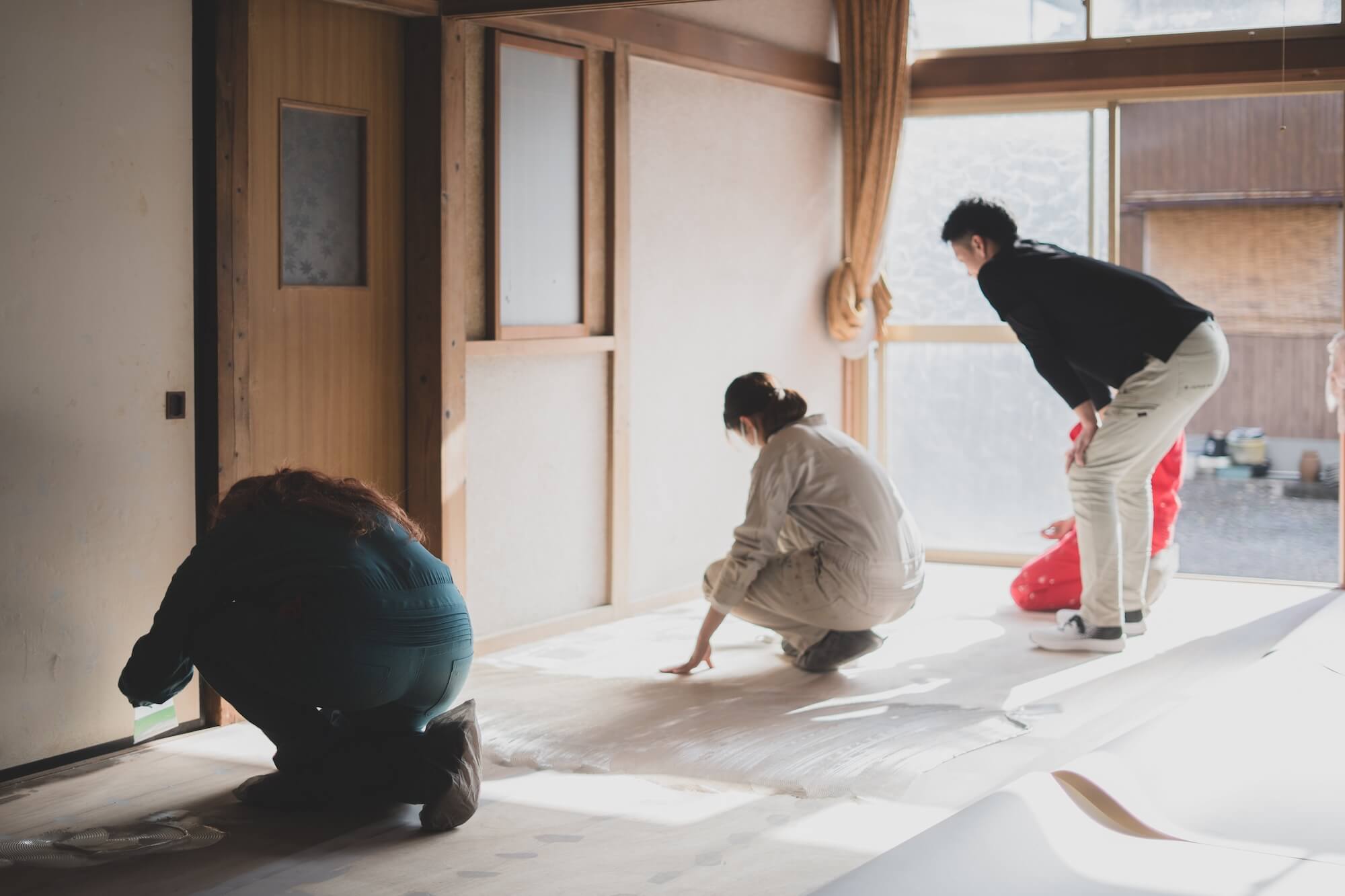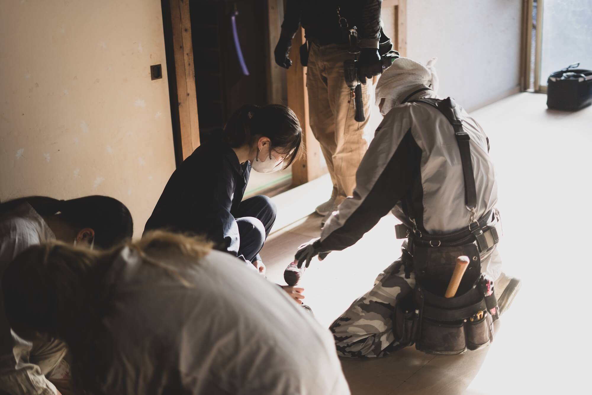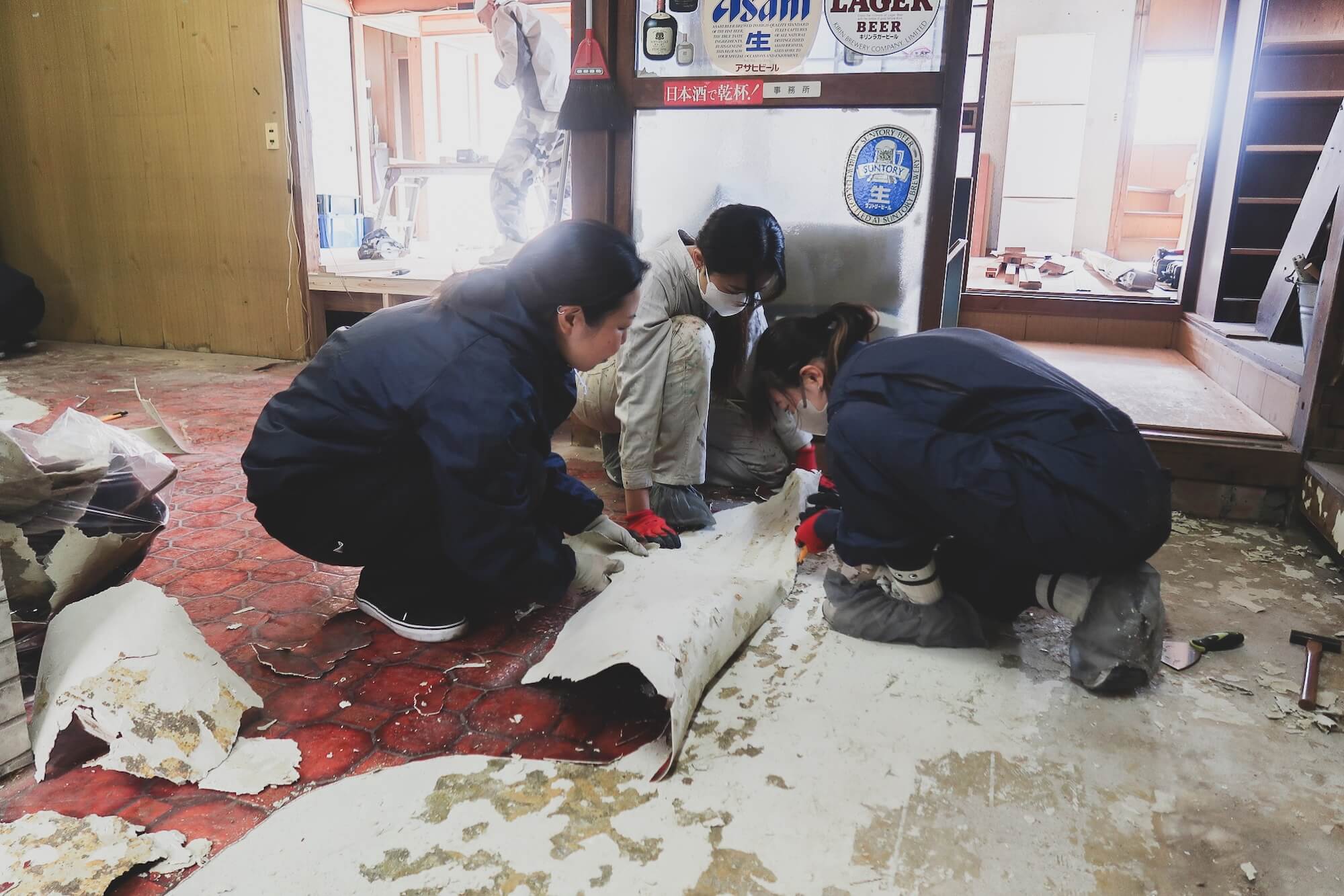 「何しよると?」その一言が、町が持つ“見守る文化”を浮かび上がらせた。2日目からは、1日目より実体験に近い旧森酒店の改修体験がスタートしました。大工さんに指導を受けながら、床材のシートを剥がしたり、畳の跡をフローリングマットで整えたり、店舗部分の壁や床の補修など、実際に手を動かして建物と向き合う時間が続きました。