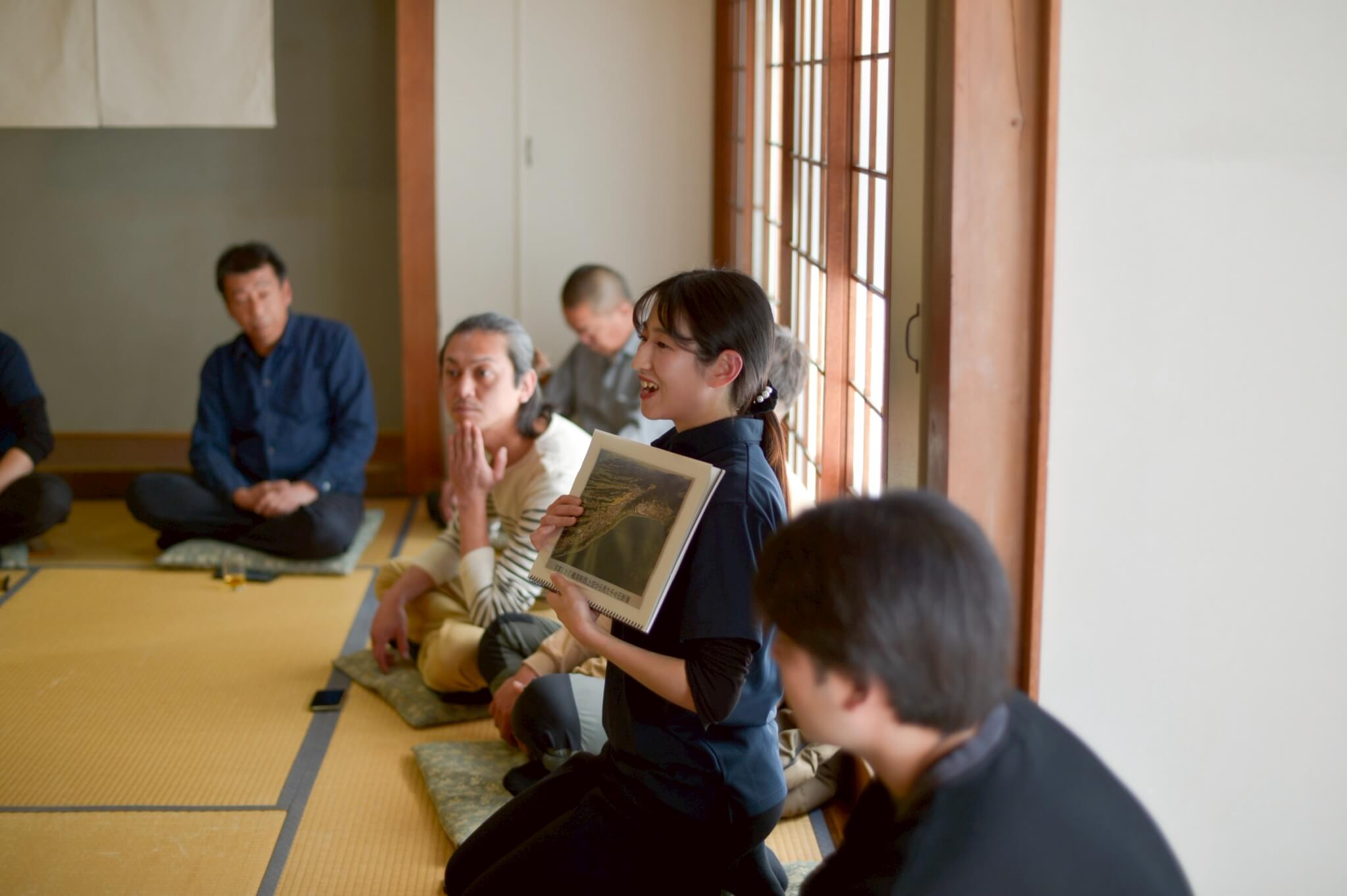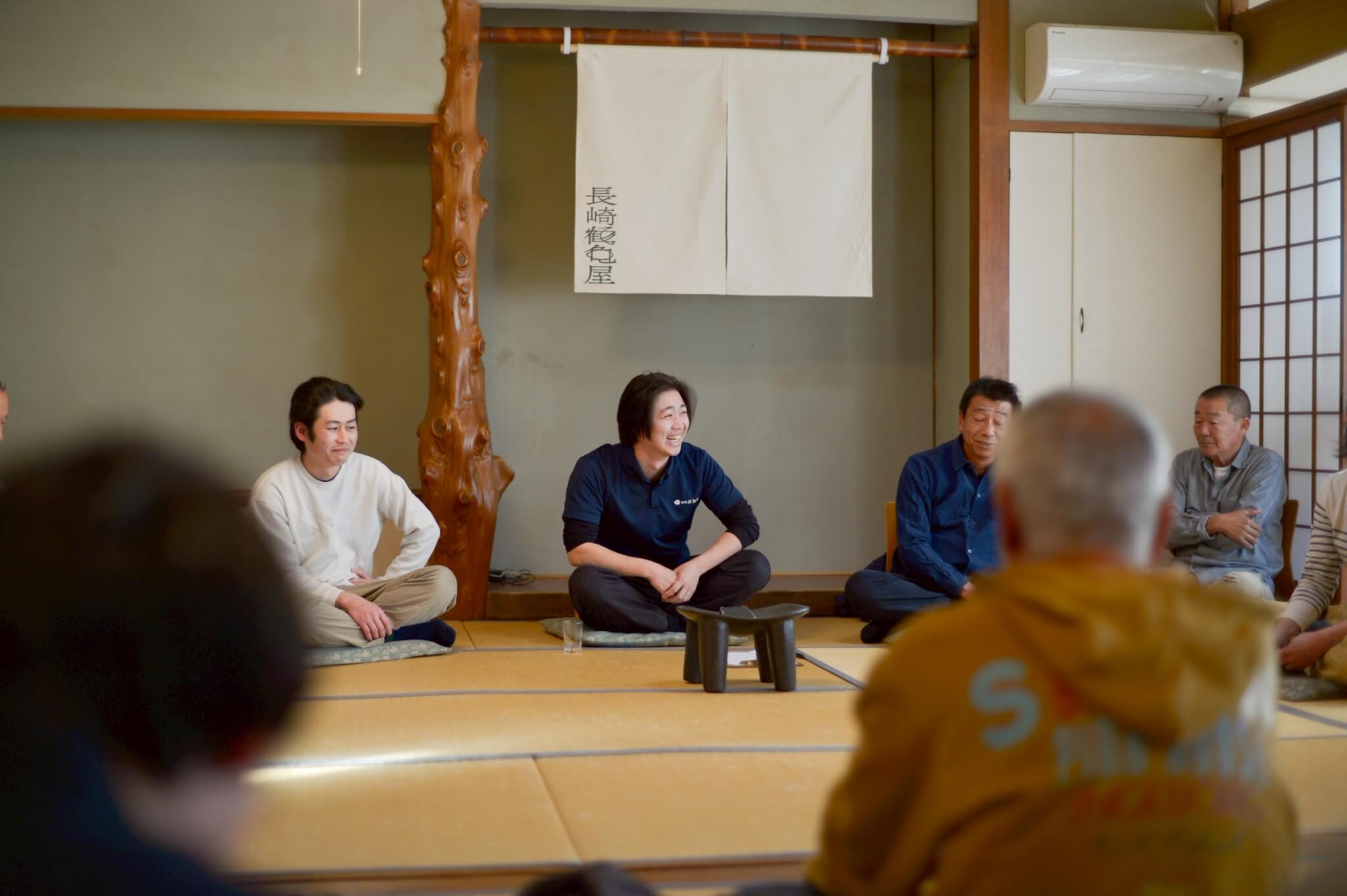 漁は朝が早いため、参加者は前日から雲仙を訪れ、蒸気家に宿泊します。それは、翌朝ただ船に乗るためではありません。雲仙の地形や成り立ち、火山活動が海へ与える影響。そうした背景を知り、頭だけでなく身体に落とし込んだうえで、海へ向かうための時間です。さっそく1日目は、橘湾の漁師さんによるトークセッションから始まります。